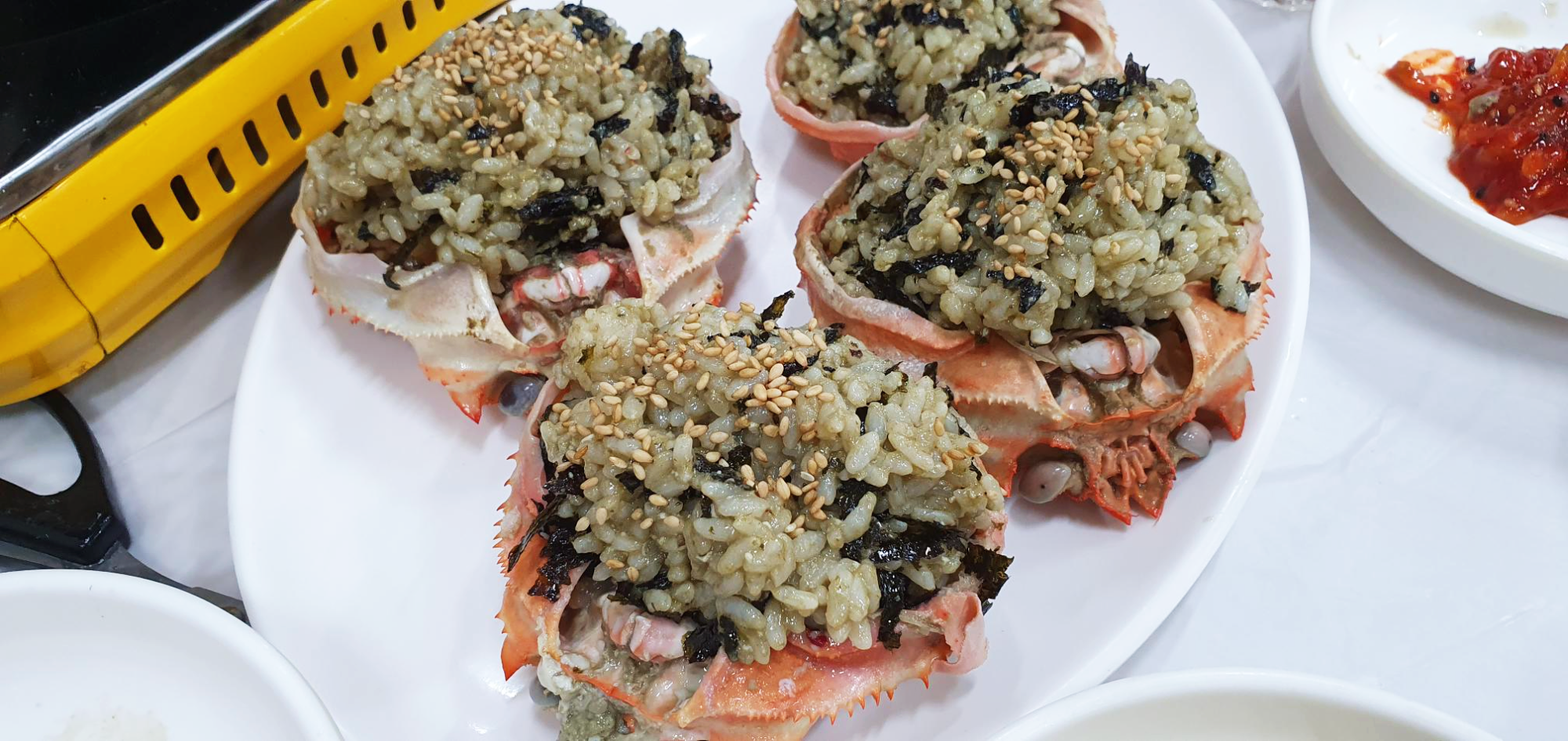 홍게B급 20마리 35,000원(흥정, 타이밍이 중요), 찜비용 10.000원, 초장값 12,000원(3,000원x4명), 매운탕 10,000원, 게딱지비빔밥 2공기 4,000원, 소주1병 4,000원