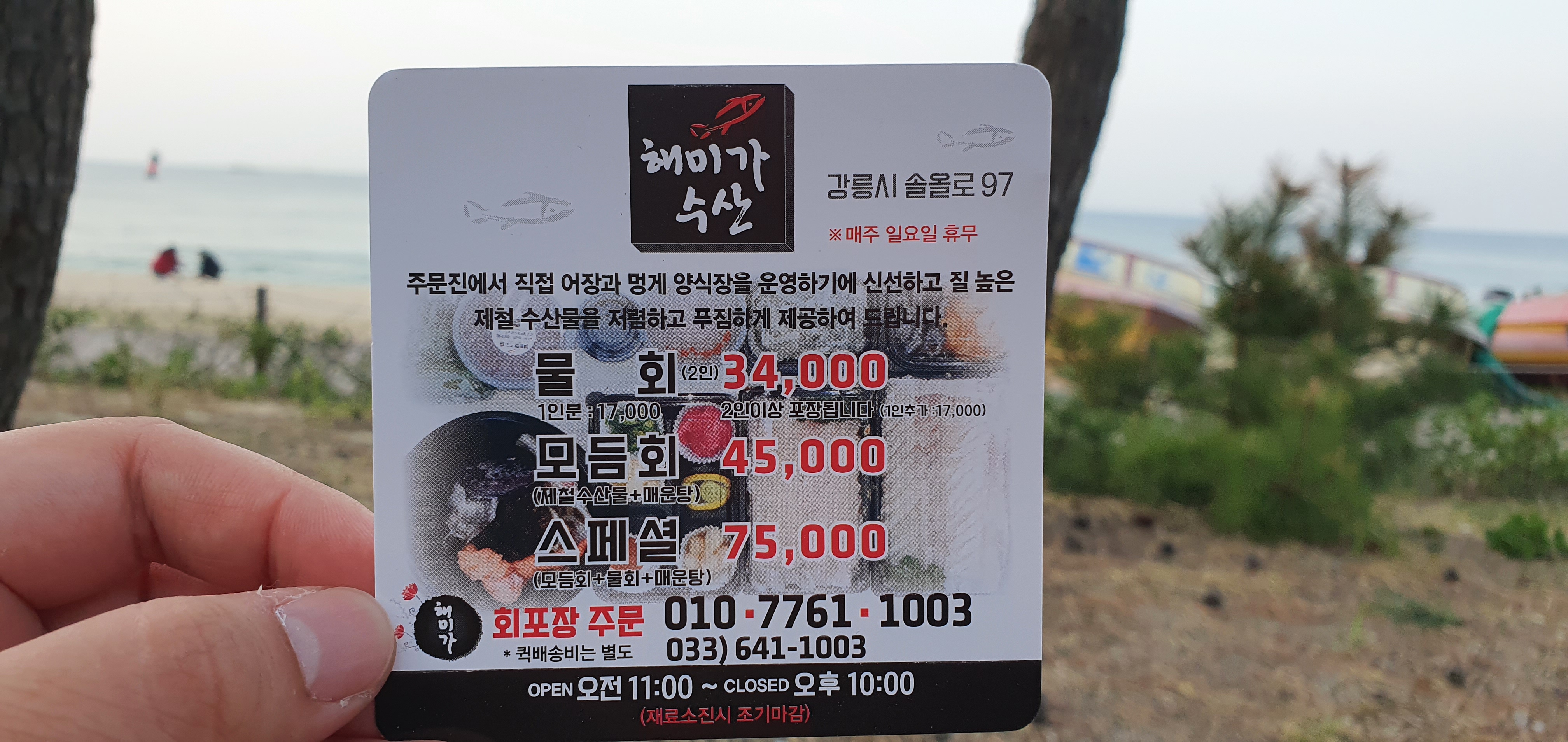 숙소 바로앞이 경포해변이고, 바다를 보면서 먹기위해 모듬회를 포장했습니다.